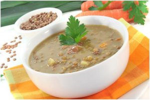 Ингредиенты: коричневая чечевица – 300 г, куриный бульон – 1¼ литра, репчатый лук – 1 шт, чеснок – 2 зубчика, сливочное масло – 2 ст. ложки, измельченный имбирь – 1 ч. ложка, кайенский перец – 1 щепотка, петрушка – 1 пучок, свежемолотый кориандр – ½ ч. ложки, тмин – ½ ч. ложки, соль – 1 ч. ложка. В кастрюле растопите масло и обжарьте на нем мелко порубленный лук. Очищенный и раздавленный чеснок смешайте с имбирем, кориандром, тмином, солью и также обжарьте. В кастрюлю выложите чечевицу, залейте горячим бульоном и после закипания варите на слабом огне в течение получаса, или проверяя полную готовность чечевицы. Готовый суп приправьте перцем, посыпьте порубленной петрушкой и подавайте к столу.