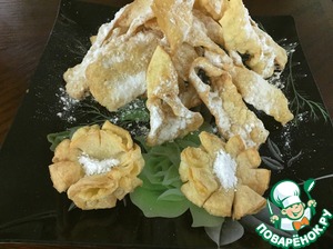 Разогреваем масло в сковороде ( где то на два пальца от дна сковороды), кладем хворост, обжариваем в течение 2-3 сек. с каждой стороны