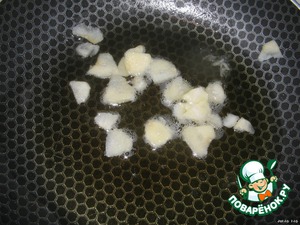 Разогреваем растительное масло в сковороде и кладём туда чеснок, нарезанный колечками. Нужно, чтобы он обжарился и отдал маслу свой аромат, а потом мы его удаляем.