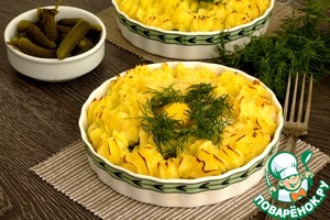 В жаропрочную форму, в которой будете подавать блюдо, на дно положить слой пюре высотой 1 см, затем слой обжаренной куры и слой нарубленных огурчиков. -