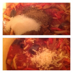 Когда салат начнет закипать, добавить соль, сахар, аджику, масло и уксус. Варить на средне-медленном огне, помешивая, минут 40.