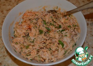 Грибы мелко режем, немного обжариваем, смешиваем с курицей и томатно-сырной массой, добавляем мелко нарезанную зелень, всю массу перемешиваем.
