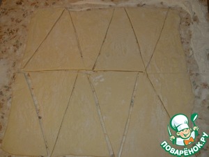 Займёмся тестом. Предварительно размороженное слоёное тесто немного раскатываем и режем на треугольники;