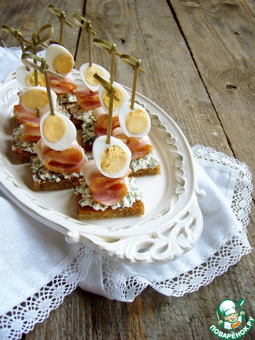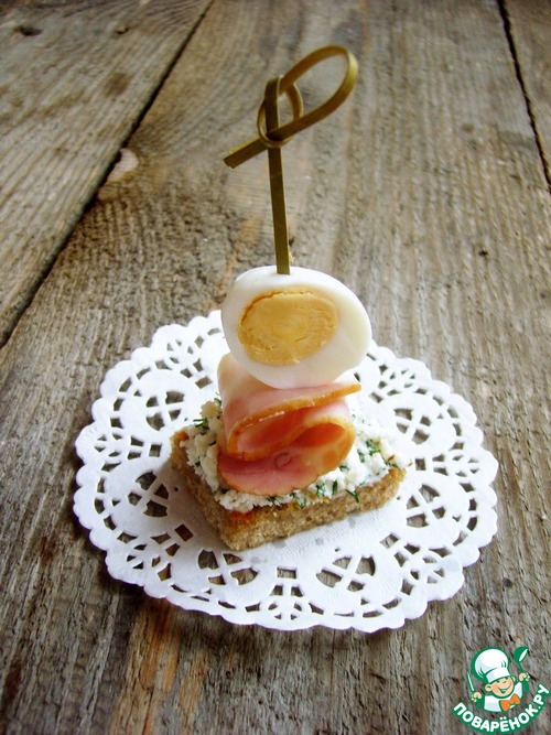 На шпажку нанизываем яйцо и бекон. Закрепляем все на смазанном фетой хлебе. Получилась очень вкусная и легкая в приготовлении закуска.