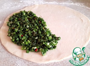 Отделить от теста кусок, скатать его в шар и раскатать скалкой.