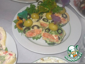 Разрезаем на порционные кусочки, можно просто выложить на тарелочку, я выкладывала их на огуречные кружочки и украшала оливкой (фото с мобильного, извините за качество). Приятного аппетита!