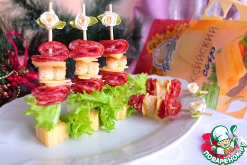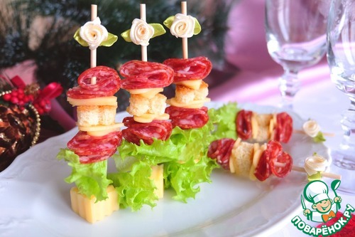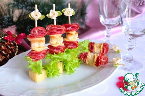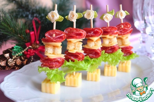 Сыр ТМ "Белебеевский" нарезать фигурным ножом на кубики, они послужат нам подставкой для будущих канапе. Ломтики сырокопченой колбасы нанизать на шпажки, чередуя сердечками из сыра и обжаренной чесночной гренкой. Завершающим аккордом оформления канапе послужит лист салата.