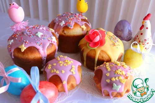 Готовые куличи покрыть глазурью, посыпать кондитерской посыпкой. Украсить по вкусу.