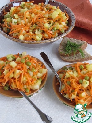 Осталось добавить к картофелю с корейской морковью заправку и зелёный горошек.