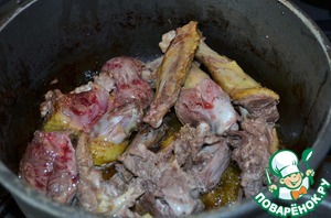В казане (на 3 - 4 л) растопить масло и обжарить куски утки.