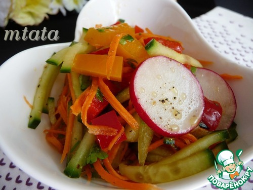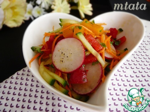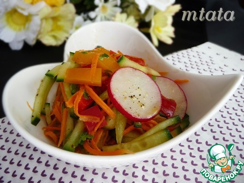 Предлагаю салат из моркови, огурца, редиса с замечательной овощной заправкой. Салат сочный, пикантный, напоминает вкус китайского салата. Идея рецепта встретилась в инете.
