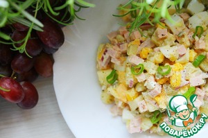 У немцев существует большое количество вариаций картофельного салата. Сегодня я хочу предложить салат с яблоками, кукурузой, колбасой и маринованными огурцами. Этим рецептом поделилась с моей свекровью её коллега-немка. Свекровь же, в свою очередь, угостила меня. На сайте похожего рецепта не нашла, а по сему охотно делюсь. Итак, Party Kartoffelsalat...