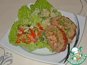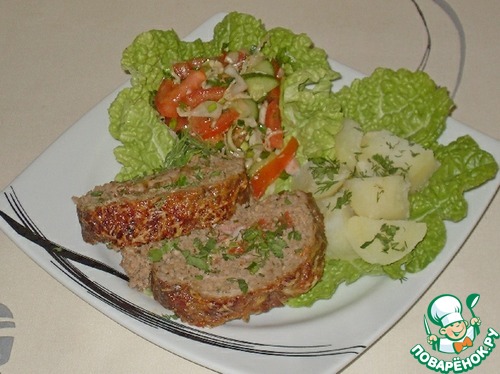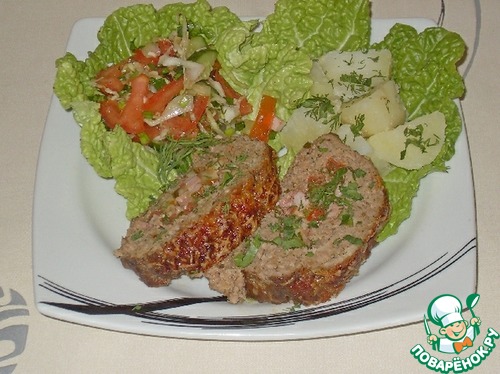 Готовый рулет слегка остудить, затем нарезать на порции и подать со всежими овощами и отварным картофелем.