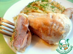 Мой вариант: брала бедрышки, они поменьше, как раз на порцию. И делала не дырочки в мясе, а просто распределила сыр с чесноком под шкуркой. Во второй раз готовила не отдельно в фольге каждую порцию, а в большой форме по тому же принципу, сначала картошечка, сверху курочка.