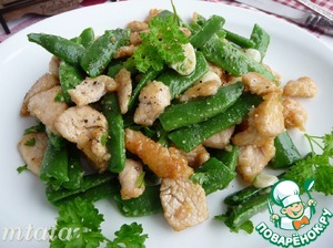 Готовила из куриного филе и замороженной фасоли. Не хотелось заморачиваться с ее отвариванием, поэтому просто обжарила минут 5 на топленом масле (не размораживая предварительно) и в конце добавила рубленый чеснок и соль-перец. А с мясом все по рецепту: крахмал сохраняет сочность, соевый соус обогащает вкус - прекрасное сочетание
