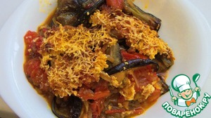 В форму для выпечки выкладываем слоями запеченные баклажаны, поджарку из помидор с луком и брынзу, последний слой должна быть брынза.