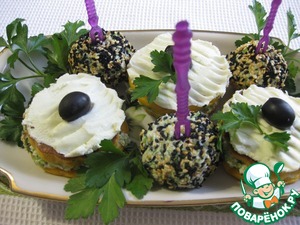У меня осталась начинка, из которой я скатала шарики и обваляла их в смеси черного и светлого обжаренного кунжута, - вышла еще одна, не менее вкусная и нежная закуска!