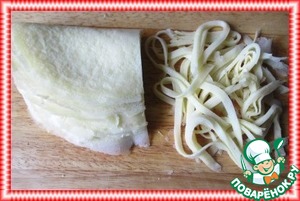 Готовые блинчики складываем стопкой, перегибаем пополам и нарезаем лапшу.