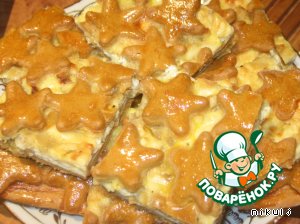 Из оставшейся части теста можно просто раскатать и порезать полосочки, прикрепить их на пирог, а можно формочками для печенья сделать вот такое звездное небо, или грибную поляну, или цветущую лужайку - ну что хотите. Смазать взбитым желтком.