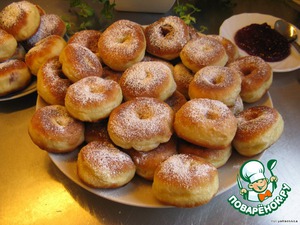 Как поднялось, осторожно выкладываем на стол, отрезаем кусочки и, заворачивая края кусочков в середину, формируем круглые пончики с дырочкой посередине.