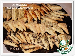 Не пеките ни в коем случае. Не остановитесь, пока всe не съедите. И главное, сами в руку прыгают. Зараза - другого слова не подберeшь. И не зря они в книжечке рецептов школы "Кордон Блю" названы Тающие треугольнички -тают во рту и с тарелки. Так описала Елена elaizik. Минимум работы, 10 минут выпечки, красиво и - вполне изысканно. Решила сразу же испробовать. Подтверждаю ее слова.