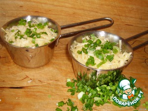 Раскладываем полученную массу по кокотницам, посыпаем тертым сыром, украшаем зеленью.