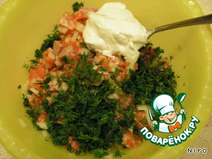 Добавляем белого перца, соли или любимой приправы для рыбы и перемешиваем. От нашей начинки уже неплохо пахнет: свежая зелень, лук, чуть-чуть лимона, и еще что-то неуловимое, но аппетитное. Чувствуете?