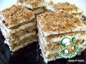 Каждый корж пропитываем, промазываем кремом. Укладываем их поочередно: ореховый – шоколадный – ореховый – шоколадный. Сверху высыпаем крошку от бисквита. Все, торт готов.