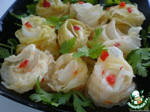 Готовую кимчи режем соломкой или сворачиваем рулетиком под закуску.