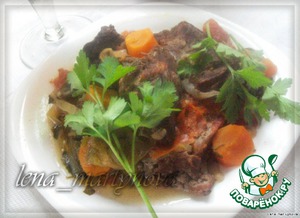 Заливаем стаканом сухого красного вина или светлого пива (подойдёт также бульон или даже простая вода), закрываем крышкой и ставим на огонь. Очень скоро овощи и мясо пустят сок, в котором и будут вариться.