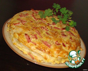 Верх тортика таким же образом намазали, ветчина плюс я посыпала кунжутом, и отправляем в разогретую до 160 градусов духовку на 20-25 минут. Запекаем до золотистой корочки.