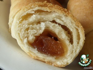 Широкую часть немного расплющить, положить 1 чайную ложку повидла, хорошо залепить края, чтобы повидло не вытекало. Узкий конец вытянуть подлиннее и завернуть рогалик.