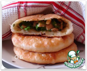 Раскатать каждый шарик, укладываем начинку (любая по вашему вкусу, не обязательно постная!) У меня грибы с луком.