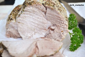 [+5]Мясо замачивала на ночь, все по рецепту. Потом нашпиговала чесноком ( 3 зубка), немного специй сверху (тимьян, черный перец, кориандр). Лучше вкус после полного остывания. Ещё бы резать красиво научиться)