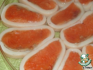 Теперь берем ломтик рыбки, вкладываем в внутрь кольца кальмара и выкладываем в судочек.