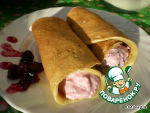 Их можно подавать с творогом, взбитым блендером и перемешанным с вареньем. У меня варенье из крыжовника. Варенье добавляйте по вашему вкусу.