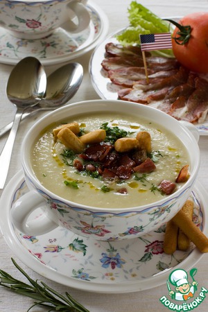 Рецептом поделилась подруга, давно и прочно осевшая в Штатах. Суп очень вкусный, полезный, с нежной, кремовой текстурой, легким ароматом розмарина и жареного лучка. Если исключить бекон, будет незаменим в пост, поскольку весьма сытен, быстро и просто готовится.