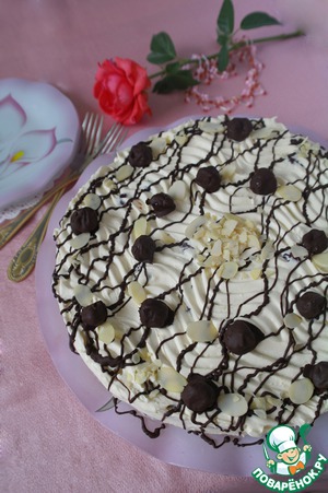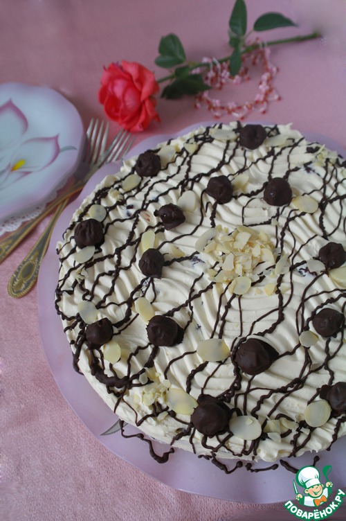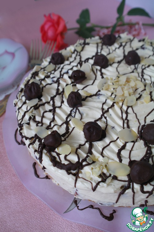 Украсьте торт вишнями в шоколаде, миндальными хлопьями, шоколадом.