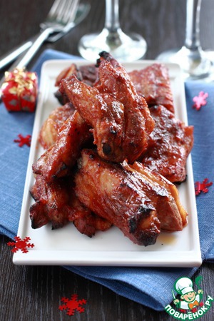 В описании к рецепту было сказано, что этот ароматный сладкий соус-маринад для рёбрышек-барбекю неотличим от соуса, который подают в одном известном ресторане в Монреале, у которого выстраивались очереди на улице в любой день недели. Как человек любопытный, я поспешила приготовить этот рецепт и... очень пожалела. Пожалела о том, что приготовила так мало ребрышек. Летом, в сезон барбекю, я его обязательно повторю. Ну а пока... готовим в духовке. Это тоже очень вкусно!
