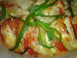 Раньше запекала просто столбиками (кружок кабачка, помидора, лука). Получались такие закусочные "тортики". Когда появилась посуда, в которой можно и запекать, и на стол подавать, стала делать такой вариант. Мне очччень нравится. Кто так еще не готовил, попробуйте! Это ВКУСНО!