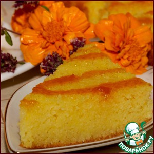1/2 стакана сахара соединить с лимонным соком и водой, кипятить пару минут. Выпеченный манник в форме заливаю сиропом, остужаю. В данном случае полила абрикосовым вареньем. Режу на треугольники и подаю к столу. Приятного аппетита!