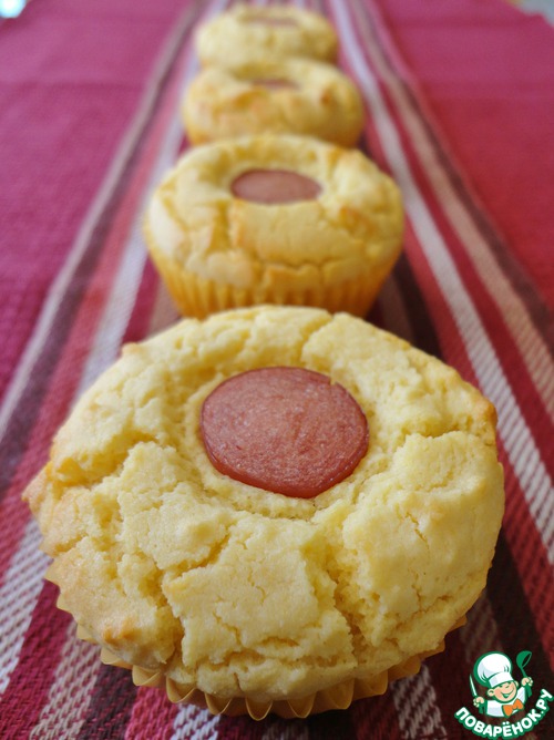 Наполняем формочки для маффинс тестом. В серединку вставляем кусочек сосиски так, чтобы она была немного выше уровня теста.