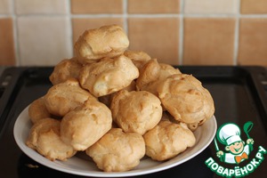 Для готовки я использовала одну кружку, ею сначала отмеряла муку (потом ссыпала её в тарелку), потом в эту же кружку налила воду (у меня вместилось 300 мл) и вылила её в кастрюлю, в которой буду заваривать тесто (поставила кастрюлю на огонь), растопила в микроволновой печи маргарин, слила его в ту самую кружку и долила 1/2 подсолнечным маслом. В воду влила все это масло, когда закипела вода, огонь сделала на минимум и всыпала муку, помешивая, и делала это до тех пор, пока масса (заварное тесто) не станет отставать от стенок кастрюли (не превратится в однородный ком).