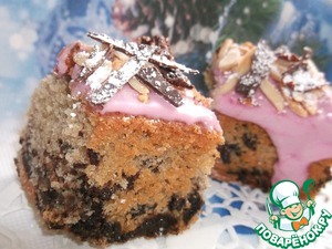 Сразу же на глазурь (застывает мгновенно) наносим кусочки миндаля и украшаем шоколадными спиралями, хотя украшение может быть совершенно разным - я воспроизвела оригинал рецепта.