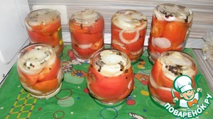 Нарезаем лук кольцами полщиной 3-4 мм и помидоры на четвертинки. Складываем все слоями в банки - кольца лука и дольки помидоров (чем больше лука тем вкусней, но без фанатизма ;) ). -