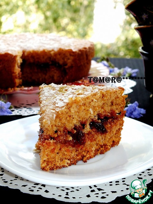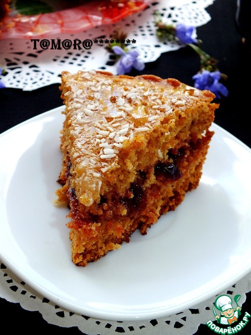 Корж разрезать на 2 части, нижний корж промазать джемом, накрыть вторым
