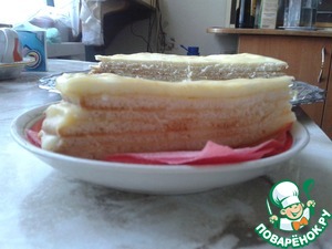 Пропитываться поставила на ночь.... Торт очень понравился!!!Очень нежный и вкусный получился! для тех кто говорит, что сухой, могу только посоветовать не сильно засушивать коржи и не делать густой крем и соответственно крема ложить побольше, вот тогда торт не будет сухим!!!