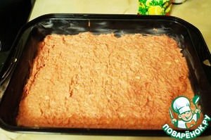 Смазываем противень сливочным маслом, выкладываем ровненьким слоем фарш и ставим в разогретую до 180 - 200 гр. духовку приблизительно на 30 мин. При запекании выделится много воды, не волнуйтесь, фарш всё равно хорошо держит форму и не разлезается.
