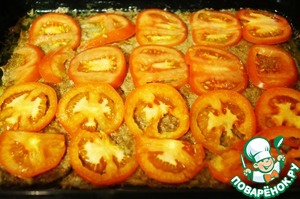Достаём фарш из духовки и покрываем тонко нарезанными кружочками помидор. Можно чуть-чуть подсолить.