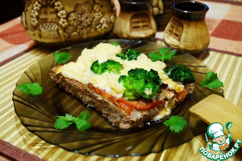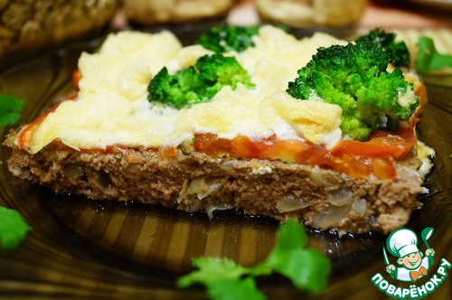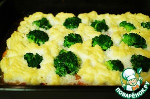 Я наморозила брокколи со своего огорода. Она уже отварена и готова к использованию в блюдах. Небольшие "деревья" из брокколи вставляем в фарш между помидорами. Получился небольшой овощной сад.